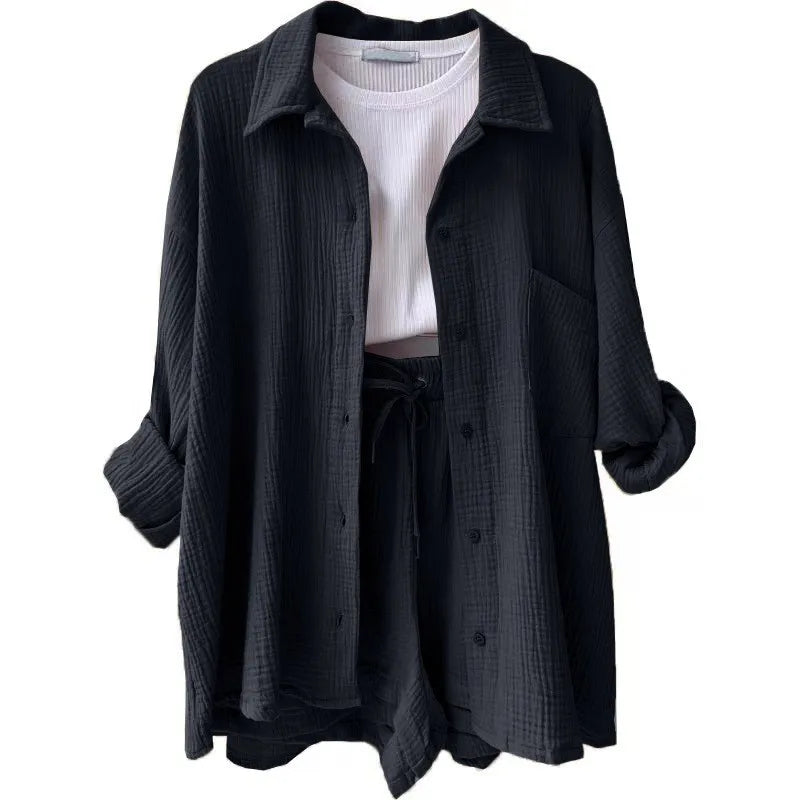 ENXO – Women’s 2-Piece Muslin Short Set | Solid Color, Button-Up Lapel – Summer 2024 Outfit